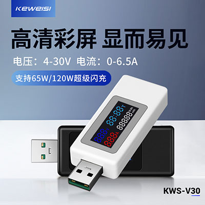 USB測試儀 | KWS-V30 | 黑色/白色 | 兼容120W內(nèi)的超級閃充 | 電壓:DC4-30V;電流:0-6.5A;計時:0-99小時;功率 :0-195W;毫安時:0-99999mAh;瓦時:0-999.99Wh; | 下載鏈接 |